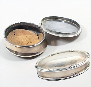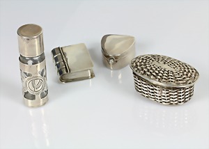 Lot: MEXICO, Silber, 925/000, 3 kl. Dosen ( 1 x Buch, 1 x Korb mit vier kl. Füßen, 1 x glatt); 1 kl. Fläschchen mit Schraubdeckel H = 54,5 mm