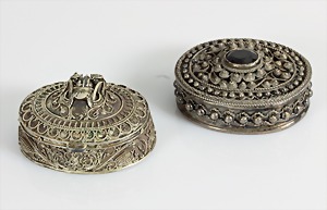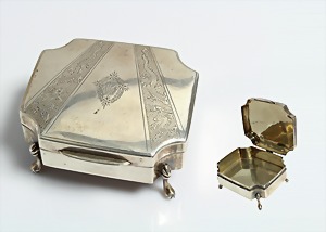 Dose um 1920, Silber 90%, wohl aus Vorderasien (englisch beeinflußt), die vier Füße sind zurückversetzt eingearbeitet, feine Drachenmotive in den Deckel eingearbeitet, innen feuervergoldet, 86 x 41,4 x 80,5 mm, gute Verarbeitung !