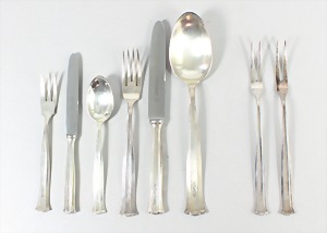 Eßbesteck 37 Teile: WELLNER 1. Hälfte 20.Jhd., Auflage 100, formschönes Besteck mit Monogramm: S, 6 x Kaffeelöffel L = 14,5 cm, 6 x Kuchengabeln L = 15 cm, 5 x Obstmesser L = 17,5cm, 6 x Dessertgabeln L = 17,8 cm, 6 x Dessertmesser l = 20,8 cm, 6 x Löffel L = 21 cm, 2 x kl. Vorlegegabel L = 18,2 cm