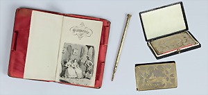 Ballspende mit Tanzbüchlein, 2.Hälfte 19.Jhd., Silber verg., aufwendig graviert, orig. Bleistift, mit Leder überzogenes Etuits, 109,5 x 72,5 x 21 mm