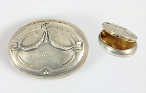 Pillendose, JUGENDSTIL um 1900/10, SCHWÄBISCH GMÜND, Silber 800/000 innen feuerverg., Gravur: Vielliebchen 9.Febr. 1907, Oval ca. 54 x 41,5 mm