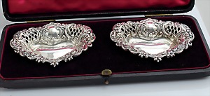 Liebesgabe für Hochzeitspaar, 1 Paar Schälchen, BIRMINGHAM 1905, Sterlingsilber 925/000, Schatulle mit Wildseide und Samt ausgeschlagen, 25,5 x 11,0 x 3,5 cm