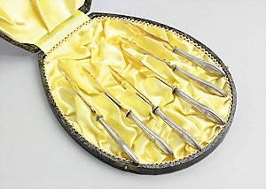 6 Obstmesser um 1910/20, Silber 800/000, L = 13,6 cm, Messerklingen vergoldet, schönes Originalkästchen, geprägtes Papier, innen mit gelben Stoff ausgeschlagen