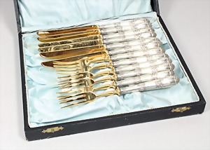 Dessertbesteck um 1900/20, Silber 800/000, 12 teilig, zartes Monogramm: MK, schönes ausgewogenes Ornament, vergoldete Klingen, nicht wirklich benutzt ! L = 15,3 - 17,0 cm, Originalschatulle innen blau eingeschlagen