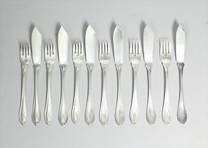 Fischbesteck, WELLNER, Pforzheim Anfang 20. Jhd., vers. 90 Auflage, je 6 Gabeln u. Messer, L = 17,5 - 21 cm, Monogramm: H,