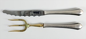 Obstbesteck, CBS, versilb. 90; je 3 Messer u. Gabeln mit zartem Perlrand, L = 16,8 u. 14,5 cm, Monogramm: H E