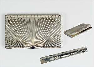 Zigarettendose, ART DECO der 1930er Jahre, signiert: "925 STERLING ITALY Cartier", formschöne Zigarettendose mit strahlenförmigem Relief, vorne u. hinten gerundet, blauer Schmuckstein im Zierelement, Deckel über Scharnier zu Öffnen, Maße: 109,5 x 66,5 x 11,5 mm, total 149,9 g, schöner Zustand mit leichter Patina