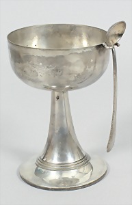 Pokal um 1920 mit Halterung für kleinen Löffel, plated, gepunzt: EP WF, D = 88,5 mm, H = 130 mm; kl. Löffel Schwedisch 2.Hälfte 19. Jhd. , Silber, gepunzt: AA D6, (nicht orig. dazugehörig), L = 118 mm