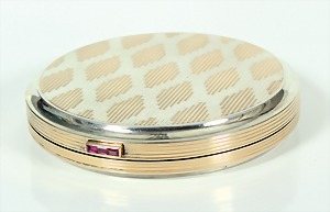 Puderdose um 1940/50, Silber 925/000, Boden und Deckel teilvergoldet, 3 synth. Rubine im Drücker, hochwertig verarbeitet, D = 77,5 mm H = 15 mm, total 94,6 g