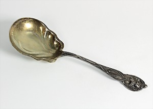 Soßenkelle, schöner JUGENDSTIL, Silber 800/000 (Restvergoldung), gepunzt UAL, L = 18,5 cm, schwere Ausführung, total 66 g