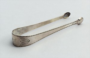 Zuckerzange um 1790/1800, Silber, wohl 13 Lot mit Stadtmarke (Regensburg ?), Gepunzt: F H R, fein trembliert u. graviert, L = 14 cm