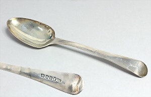 Löffel, ENGLAND LONDON 1788/89, RICHARD CROSSLEY (Spoonmaker), Silber 925/000, Gravur: an einer Kette hängender Schlüssel wird von einer Hand umschlossen, L = 22,3 cm, 76 g