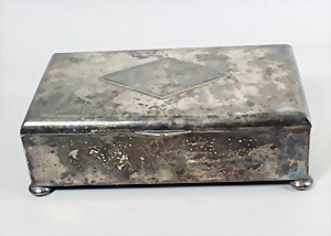 Schatulle auf vier Füßen, 1930er Jahre , versilbert, innen mit Holz ausgelegt, Deckel mit Scharnierbewegung, Maße: 24 x 13,5 x 7,5 cm