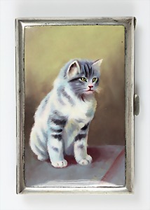 Etui / Dose "KATZE", PFORZHEIM, Alpacca, Deutsches Reich Gebrauchsmuster, innen feuervergoldet, feine Emaillearbeit mit sitzender Katze, Maße: 87,5 x 58,5 x 15,5 mm