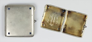 Mini Zigarettendose für die Damenhandtasche, Pforzheim um 1910, Silber 800/000, gemarkt: LOUIS KUPPENHEIM, in den Ecken der fein strukturierten Oberfläche sind 4 Saphire ( Princessschliff) eingelassen, Drücker mit Saphircabochon, Sprungdeckel, innen feuervergoldet und Monogram: ML, Maße: 55 x 49,5 x 11 mm, feiner ENTWURF ! Bänder innen fehlen !
