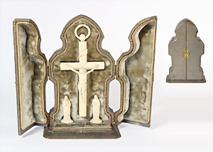 Reisealtar, wohl Frankreich um 1880/1900, Jesus an einem, aus Elfenbein geschnitzten Kreuz ( H = 17,5 cm), zu Füßen zwei kl. Marien Figuren, der Reisealtar mit orig. Schatulle mit zwei Türen zum Aufklappen (Papier überzogen), befindet sich in einem sehr guten Zustand ! Höhe der Schatulle ca. 22,5 cm