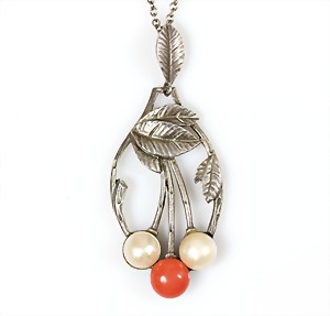 Lot Korallenschmuck, 2.Hälfte 19.Jhd.: 2 Paar Ohrhänger mit Korallen, Double; 1 Brosche, Silber 800/000 mit16 Korallenboutons u. 1 Naturperle, L = 49,4 mm