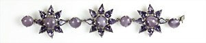 Armband "STERNE" PRICHARÉ Kaufbeuren Neu-Gablonz 1950/60er Jahre, weißfarbenes Metall, signiert: PCH, lilafarbene facettierte Glastropfen, 7 St. Changierende Cabochons, B = ca. 41 mm, untergebautes Kastenschloß, L = 19,5 cm