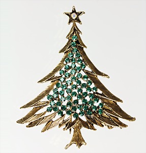 Weihnachtsbaum-Brosche USA 1950/60er Jahre, goldfarben, signiert: WEISS; farbige Glassterne, grüne Perlen und goldfarbene Strasssteine, ca. 80 x 65 mm