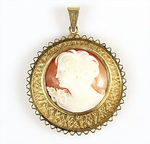 Anhänger 1950er Jahre, GG 750/000, Muschelgemme, fein geschnittenes Damenportrait, H = 43,5 mm