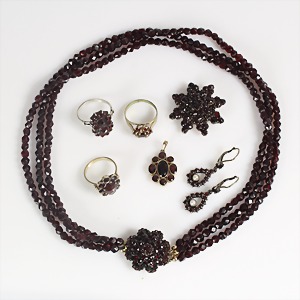 Lot: Kette u. Armand, "ART-DECO" der 1930/40er Jahre, Kette, Oliven D = 6,2-17,2 mm, L = 52,5 cm; Armband, D = 48 mm, B = 27,5 mm, auf doppeltem Gummizug