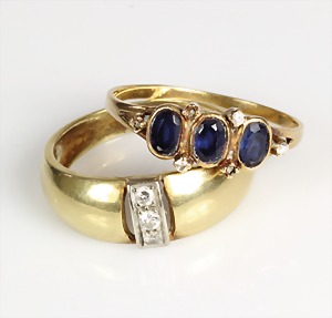 2 Ringe "RETRO" aus den 1970er Jahren, WG 585/000, 1 Ring mit 6 Smaragden, 1 Ring mit 6 Saphiren (alle Steine facettiert), RW ca. 53,5