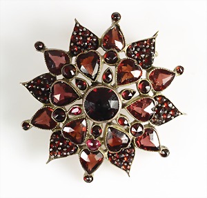 Brosche um 1890/1900, Tombak vergoldet, Rosette mit bömischen Granatenrosen ausgefasst, D = 34,5 mm, schöne Qualität !