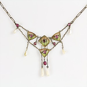 Feines "JUGENDSTIL" Collier um 1900, Silber 900/000, DEPOSE (nicht sig.), Fenster-Emaille (plique à jour) in zarten grünen Farbtönen, die einzelnen Elemente sind mit rosa Steinen besetzt (Turmaline?) und mit einer zarten Kette verbunden, 6 Naturperlen geben dem Collier einen besonderen Charme, vorne: H = 47,5 mm, L = 49 cm, schöner Originalzustand !