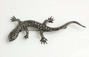 Brosche, "SALAMANDER", 1930/40er Jahre, Silber 835/000, sig.: H&S oder M&S (Punze undeutlich !), Türkise u. 1/2 Perlen, rote Steinaugen, plastisch schön ausgearbeitet, unter der Broschierung sind Ösen für eine KetteL = 56,5 mm