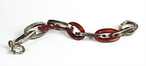 Lot, "IKORA WMF", Metall weißfarben, 1 Armband mit Kastenschloss, 3 grüne Glassteine, B = 24 mm, L = 19,2 mm; 2 Kleiderclips: 1 x rot/schwarzes Glas 34 x 28,7 mm, 1 x gelb/rotes Glas 22,7 x 34,7 mm