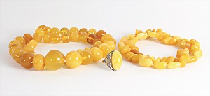 Lot Bernstein: teilweise "BUTTERSCOTCH", 1 Ring, Silber 925/000, RW ca. 59,5; 1 Kette im Verlauf, Drehschließe, D = 8,5 - 22 mm, L = 60 cm; 1 Kette (unregelmäßig) mit Drehschließe, L = 51 cm, alles total 91,8 g