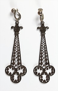 Ein Paar Ohrhänger, "BERLINER EISEN" Schmuck um 1830/40, beidseitig sehr fein strukturiertes Eisen, H = ca. 90 mm, die Ohrclips sind später ergänzt (aber alt !), ein wichtiges Zeitzeugnis u. in vielen Museen zu finden. Eisenschmuck bekommt man selten in die Finger/an die Ohren !