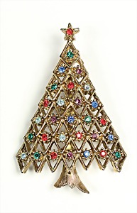 Weihnachtsbaum-Brosche USA, goldfarben, signiert: JJ (Jonette Jewelry, USA), farbige Strasssteine, in Grün, Rot, Violett u. versch. Blautöne, rautenförmig angeordnet, ca. 54,5 x 35,5 mm