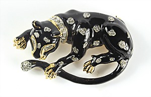 Brosche "PANTHER", goldfarben, signiert: VOGUE BIJOUX, schwarzes Emaille mit klaren Strasssteinen besetzt, vollplastisch schön ausgearbeitet, ca. 52,5 x 33,5 mm