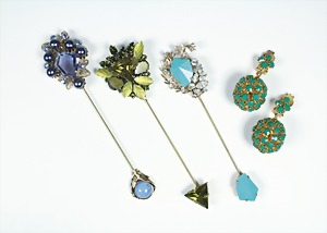 Lot: 3 Hutnadeln u. 1 Paar Ohrhänger "KUGEL", PRICHARE Kaufbeuren Neu-Gablonz 1950/60er Jahre, goldfarben, signiert: PCH; Hutnadeln mit weißem Strassbesatz, gravierten Blättern dkl. Kunst-Perlen, verschiedenfarbiges transparentes u. opakes Glas, L = 12,8 - 14,0 cm; 1 Paar Ohrhänger besetzt mit opaken türkisfarbenem glas, H = 46,5 mm (als Clip gearbeitet !)