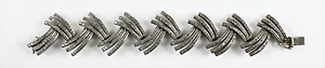 Collier, "ART-DECO" der 1930/40er Jahre, "BENGEL" idar-Oberstein, Metall platiniert, Meistermarke (unleserlich), schwarzer Bakelit, graphische Elemente (1/2 Kugeln u. Trapeze) verjüngen sich formschön zur Kette, L = 49 cm