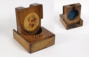 Schatulle/Ständer für Taschenuhr "NICE", Holz, um 19.Jhd., bemalte Holzintarsie, Aussparung für Taschenuhr D = 40,5 mm, innen mit Samt ausgeschlagen, Schatulle ca. 78,5 x 65,5 x 26 mm