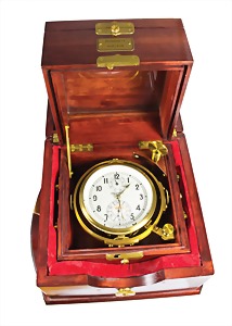 Marienechronometer "POLJOT" im doppeltem Holzkasten, UDSSR 1993, kardanisch aufgehängtes Messinggehäuse, verschraubte Lünette, weißes Ziffernblatd. mit arab. Zahlen, 56 Std. Gangreserve, bei 12 Uhr exzentr. Sek., bei orig. 6 Zeiger, verg., Werk, mit Genfer Streifen, Kette u. Schnecke, Chronometerhemmung, Komp.-Unruh m. zylind. Spirale, orig. Chronometer-Zeugnis anbei ! Maße ca. 24 x 24 x 24 cm mit Trageriehmen (Leder), Uhr läuft !