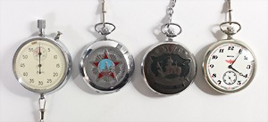 Lot: 3 Russische Taschenuhren, D = ca. 50 mm; 1 Stopper, alle mit Uhrenkette, ungeprüft !