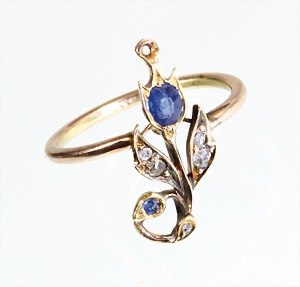 Ring, "JUGENDSTIL" um 1900, GG 585/000, 2 Saphire fac., 5 Diamantrosen weiß, RW ca. 56,5