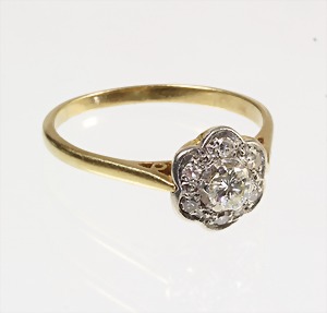 Ring 1.Hälfte 20.Jhd., GG 750/000, 1 Brillant ca. 0,20 ct tw/w-si (an der Rundiste kl. Chip), 6 Diamanten weiß, RW ca. 56