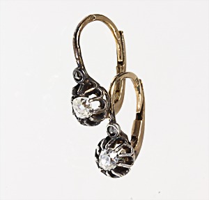 1 Paar Ohrhänger (Klappbügel), um 1900, GG 585/000, 2 Altschliff-Diamanten ca. 0,30 ct weiß, 2 Diamantrosen weiß (Diamanten in Silber gefasst), H = ca. 15,0 mm