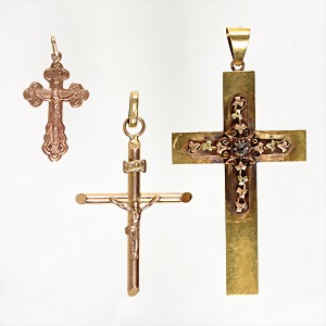 Lot: 3 Kreuze, 2.Hälfte 19.Jhd., RG 585/000, kl. Kreuz H = 36,2 mm, gr. Kreuz mit Diamantrose, H = 77,0 mm, total 14,4 g