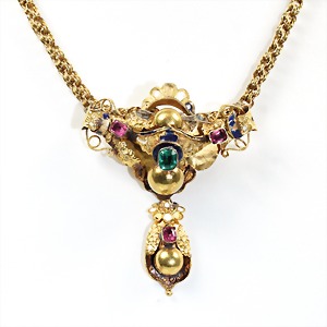 Kette/Collier, Trachtenschmuck Anfang 19.Jhd, GG 585/000 feuerverg., 1 grüner Stein (Smaragd wohl aus dem Habachtal), 3 rosafarbene Steine, alle im antiken Schliff (facettiert), Reste von farbigem Emaille, nicht im perfekten Zustand (Reparaturstellen) aber dafür mit einem besonderem Charm ! Vorne H = 51,5 mm, L = ca. 42,0 cm