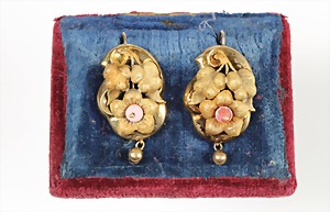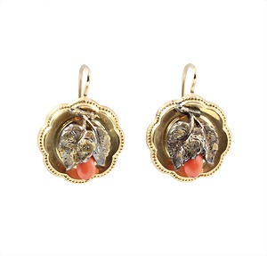 1 Paar Biedermeier Ohrhänger um 1830/40, GG 333/000, feuervergoldet, filigran gearbeitete Blätter, 2 Korallen, H = 24,7 mm Für diesen Artikel ist ein Versand in nicht EU-Länder leider nicht möglich !