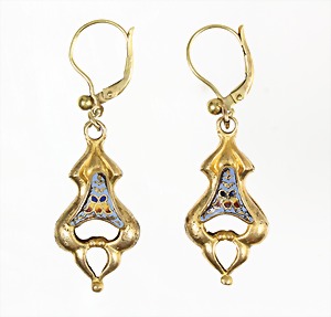1 Paarr Ohrhänger, Biedermeier um 1830/40, GG 333/000, feuervergoldet, beidseitig farbig emailliert, Ohrbügel später (alt ersetzt), H = 51,4 mm