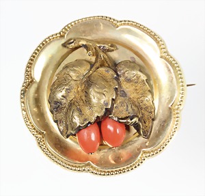 Brosche "BIEDERMEIER", Östereich Mitte 19.Jhd., GG 585/000, Koralle, plastisch schön ausgearbeitetes Blattwerk, D = 36,2 mm Für diesen Artikel ist ein Versand in nicht EU-Länder leider nicht möglich !