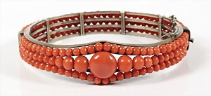 Korallen-Armreif um 1880, Silber, Korallenkugeln 3-reihig angeordnet, Korallenbouton D = 10,0 mm, Kastenschloss mit Sicherheitskettchen, innen: ca. 57,3 x 48,0 mm Für diesen Artikel ist ein Versand in nicht EU-Länder leider nicht möglich !