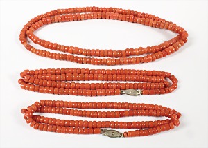 Lot: 3 Korallenketten, 2 mit Schließe,1 Kette L = 55,5 cm; 1 Kette L = 52,0 cm; 1 Kette endlos, D = 5,5-7,9 mm, alle total 128,5 g Für diesen Artikel ist ein Versand in nicht EU-Länder leider nicht möglich !
