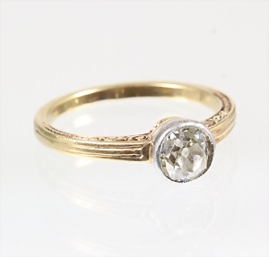 Ring um 1900, GG 585/000, Altschliff-Diamant ca. 0,33 ct getöntes weiß (weiß gefasst), seitlich mit filigranem Ornament, RW ca. 44,5 (Größe kann von unserem Goldschmied geändert werden !)